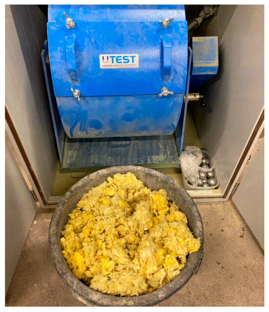 The wool used in the study is polymerized and dry, in the form of granules with a fiber length of 3–5 cm for stone wool and 5–10 cm for glass wool. In order to achieve a homogeneous bulk material, the wool samples were pulverized. After analyzing the available literature [26] on the pulverizing of mineral wool fibers, a ball mill of the Los Angeles type complying with EN 1097-2 [27] was selected to grind the wool (Figure 2).