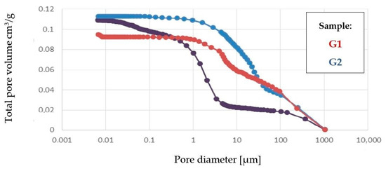 In the samples examined, a lower thermal conductivity coefficient was achieved using the sample with higher porosity. The series of samples designated G1 had an average thermal conductivity coefficient of 1.053 W/(m·K) and a designated porosity of 20.91%. In contrast, the G2 series of samples with a higher porosity of 22.61% achieved a better thermal conductivity coefficient, with an average of 0.953 W/(m·K). The differences shown are small; nevertheless, they confirm the correlation, showing the relationship: the higher the porosity, the lower the thermal conductivity coefficient. In sample G1, a network of numerous smaller pores can be seen and are connected to each other. In contrast, in sample G2, there are apparently fewer pores on the microphotograph itself, but they are wider, closed, and more oval. An additional test, the results of which are shown in the graph below [Figure 9], demonstrates the proportion of each pore size in the sample. A higher pore volume is seen in the G2 sample.