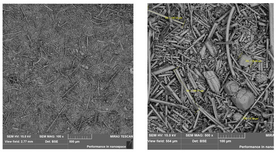 The results of the tests presented in Table 5 on the compressive and flexural strengths of the tested glass-wool-based and stone-wool-based geopolymer mortars showed their properties and the differences between them. The G1 recipe based on glass wool had a higher compressive strength than the G2 samples with comparable flexural strength. The strength of the geopolymer is influenced by many factors related to the fraction, the chemical composition of the geopolymer powder, its Al-Si ratio, the composition and amount of the chemical activator or, finally, the time and temperature of aging of the sample. There is, naturally, the question of what causes the differences in the strengths between the G1 and G2 series samples. Since the aging time and manufacturing methodology were the same, the answer must be sought in the formulation used. First of all, there are the differences between the geopolymer flours, WS2 and WM2, that were used. Despite the similar granularity, the WS2 meal used in the recipe has a much larger specific surface area. From the perspective of studying grain size distribution via laser diffraction in the case of mineral fibers, attention should be paid not only to the fiber length, which depends on the milling process, but also to the fiber thickness, which is invariant to the milling process. Glass fibers are thinner and more fragile; for this reason, the specific surface area of glass-wool-based WS2 meal is higher. In the microphotographs of the WS2 (Figure 10) and WM2 (Figure 11) powdered meal samples, the difference in the microstructure is evident. The area shown in the microphotograph of the WS2 sample shows more particles of smaller size. The WS2 sample is also more homogeneous, with no visible lava clumps during the pulping process (particles of 73 μm and 200.21 μm in the 100 μm image shown in Figure 10). Both samples have elongated particle forms. The grinding process evidently shortened the length while maintaining the thickness of the fibers. The presence of elongated particle forms has a positive effect on the flexural strength of both samples.