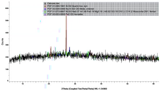The geopolymer binder was obtained by alkaline activation of fly ash (FA) obtained from Rovinari power plant in Romania. Fly ash was chosen because previous studies [87] have shown that its chemical composition and particle size distribution make it suitable for the production of geopolymer binders with increased mechanical performances. Characterization of the fly ash was carried out prior to its use in the preparation of the geopolymer binder. This included the determination of the chemical composition by XRF analysis and the assessment of the R0.045 fineness (Table 1 and Figure 1). The chemical composition and the particle size distribution of the fly ash were investigated using X-ray fluorescence (XRF) analysis, using a HELOS RODOS/L, R5 instrument (Sympatec GmbH, Clausthal-Zellerfeld, Germany) (Table 1). The mineralogical composition of the fly ash was investigated using an X-ray diffraction (XRD) analysis (Figure 2), Bruker D8 ADVANCE X-ray diffractometer (Bruker, Karlsruhe, Germany). Scans were collected in the range of 5–60° (2θ) with a step size of 0.02° and a scan speed of 10 s per step.