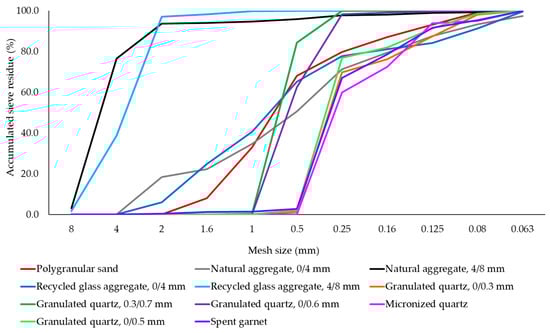 For the formulation of geopolymer composites, different types of aggregates with a maximum particle size of 8 mm have been incorporated into the geopolymer binder during the preparation process, with specific identification codes (P2–P12) for each mixture. These include polygranular CEN- NORMSAND EN 196-1 sand (P2), granular class 0/4 mm natural aggregates (P3), granular class 4/8 mm natural aggregate (P4), granular class 0/4 mm recycled glass aggregate (P5), granular class 4/8 mm recycled glass aggregate (P6), micronized quartz (P7), 0/0.3 mm granulated quartz (P8), 0/0.5 mm granulated quartz (P9), 0/0.6 mm granulated quartz (P10), 0.3/0.7 mm granulated quartz (P11) and spent garnet (P12). For each type of aggregate used in the production of the samples, bulk apparent density was analysed in accordance with EN 1097-3 [89] (Table 2); and particle size distribution (Figure 3) was analysed using a sieving method. This range of aggregates was chosen to facilitate an analysis of their influence on the physico-mechanical properties of the geopolymer composite, considering both the nature of the aggregate and the granularity characteristics.