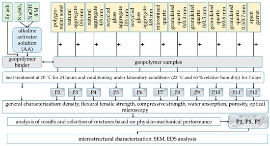 After being cast into 40 × 40 × 160 mm moulds, with the corresponding vibration, the samples were subjected to a (70 °C for 24 h) heat treatment using a thermostatic MEMMERT ULE 500 chamber (MEMMERT GmbH+Co.KG, Schwabach, Germany). After demoulding, the geopolymer samples were stored in laboratory conditions (T = 23 °C and RH = 65%). Testing to determine their mechanical properties was carried out after 7 days. The experimental research methodology is graphically outlined in Figure 4.