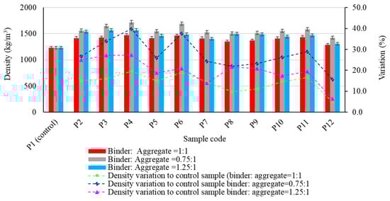 As observed in Figure 5, as expected, the density of the geopolymer samples increased when aggregates were incorporated in the geopolymer binder matrix, regardless of their type, compared to the control sample. However, results show that both the type of aggregate and the geopolymer binder to aggregate ratio influence the behaviour in the variation of this parameter. It can, therefore, be stated that irrespective of the geopolymer binder to aggregate ratio the maximum percentage increase in bulk density compared to the control sample was obtained when incorporating granular size 4/8 mm natural aggregates (Mixture P4). This increase was 19.55% for the geopolymer samples with a binder: aggregate ratio 1:1, 39.72% for 0.75:1 and 27.33% for 1.25:1. The lowest increase in bulk density, regardless of the geopolymer binder to aggregate ratio, was obtained for samples produced using spent garnet as the aggregate: 4.91% (binder: aggregate ratio 1:1), 15.65% (binder: aggregate ratio 0.75:1) and 6.41% (binder: aggregate ratio 1.25:1).