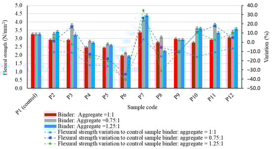 Thus, except for micronized quartz (P7), which showed a slight increase (3.47% with respect to the control sample), a reduction in flexural tensile strength was observed for all the types of aggregate used when their respective quantities were equal to that of the geopolymer in the composite matrix.