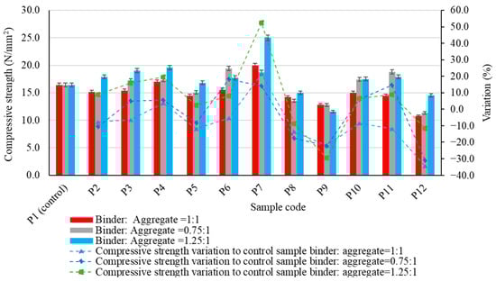 When analysing the influence of the type of aggregate, its granulation and the geopolymer binder:aggregate ratio on the compressive strength of the geopolymer composites (Figure 7), several similarities can be observed when compared with the control sample (geopolymer binder without aggregates). Regardless of the geopolymer binder to aggregate ratio, the most significant reduction in compressive strength compared to the control is observed when using spent garnet (P12): 34.46%, 30.99% and 11.64%. In addition, the use of micronized quartz (P7) increased the compressive strength of the samples regardless of the geopolymer binder to aggregate ratio, with values of 21.47%, 14.21% and 52.38%. The use of quartz aggregates does not guarantee a consistent effect on compressive strength. Depending on the granulation of the aggregates, compressive strength may be improved or reduced. Even when using recycled glass aggregates, an increase in the compressive strength was observed. It should be noted that the granular class of the aggregates is a key element that can have either positive or negative effects. In some cases, the compressive strength of the composite can be increased by more than 18%, especially when these aggregates with a large grain size (4/8 mm) are introduced into the geopolymer binder matrix. However, this is at a reduced quantity (geopolymer binder to aggregate ratio = 0.75:1).