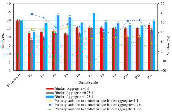 The experimental results indicate the influence of introducing aggregates into the geopolymer binder matrix, but there is also an influence from the characteristics of these aggregates on the apparent porosity of the composites (Figure 8). As observed, in general, the porosity has a decreasing trend with the introduction of aggregates into the geopolymer binder matrix. This decreasing trend of porosity is generalized for the situations binder:aggregate = 1:1, respectively 0.75:1, regardless of the nature of the aggregates. In the case of a binder:aggregate ratio = 1.25:1, exceptions, i.e., increases in open porosity compared to the control sample, are observed for the situations P4 (natural aggregates granular class 4/8 mm), P5 (glass granular class 0/4 mm) and P7 (micronized quartz).