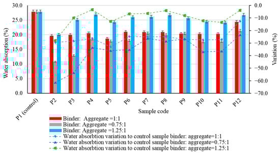 In terms of water absorption of the geopolymer binder composites (Figure 9), it is most evident that for all types of aggregates used, no specific behaviour could be observed for the results obtained when compared to the control sample. It can also be observed that a 25% reduction in the amount of geopolymer binder in the composite (geopolymer binder to aggregate ratio = 0.75:1) results in a reduction in water absorption, whereas an increase in the amount of geopolymer binder in the composite (geopolymer binder to aggregate ratio = 1.25:1) results in an increase in this parameter compared to the value obtained for the same binder to aggregate ratio.