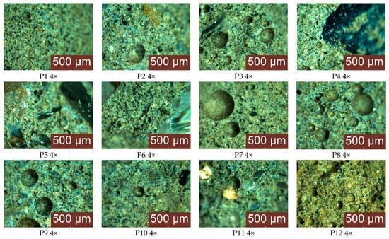 Microscopic analysis of the structure of the geopolymers (Figure 10) has highlighted mixtures in which the distribution of the aggregates is homogeneous and uniform. An exception is seen when using natural or recycled glass aggregates with large particle sizes (P4) and (P6), which show a tendency towards segregation. In addition, the presence of pores formed during the setting process was observed in the mass, with a variable distribution and size depending on the type and granular class of the aggregates. The control sample has a porosity characterized by an even distribution of numerous small pores. In contrast, the composite samples show a non-uniform distribution of porosity, with the presence of larger pores (maximum diameter, 1140 μm, for sample P7) but in smaller quantities. The use of recycled glass aggregates tends to reduce porosity, both in terms of pore size and frequency. In this case, the behaviour of the geopolymer samples is attributed to a combination of effects: improvement due to reduced porosity, but also lack of improvement due to the tendency for segregation, with the aggregates migrating towards the lower part of the specimens; this is probably due to a reduced degree of cohesion with the geopolymer binder. Quartz aggregates generally tend to reduce porosity but depending on their granulometry the composite matrix may have areas of clustered pores along with more compact areas of few and small pores. Spent garnet has a comparable effect on porosity, such as the patterns observed with coarse sand and natural aggregates, where the composite matrix presents a combination of larger and smaller pores which are randomly distributed.