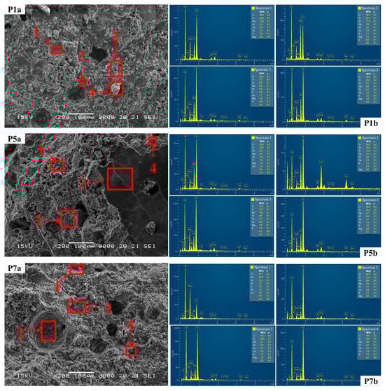 The main features observed in the SEM images of the three samples analysed include a compact distribution of fully reacted, partially reacted or unreacted fly ash particles, a coherent and homogeneous mass encapsulating and binding the particles (the geopolymer binder), and networks of intergranular and intragranular pores [81]. Thus, the SEM images reveal that sample P7 exhibits a more granular appearance, which is characterized by larger-diameter pores that are fewer in number compared to specimens P1 and P5. Although a well-developed geopolymer matrix is observed for sample P5, it appears to be less homogeneous and uniform than that observed for P1 and P7, which can be attributed to the inclusion of the glass aggregate. Furthermore, the glass aggregate appears to be well embedded and encapsulated within the geopolymer binder, with little to no porosity or voids surrounding the aggregate particles. In addition, all samples show small cracks at low magnification.