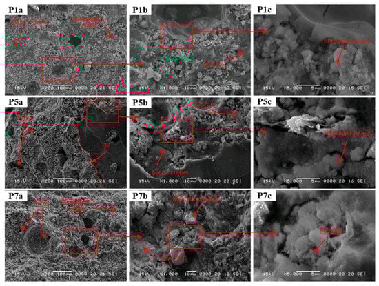 SEM images of the control sample (P1) and the samples containing glass aggregate (P5) and micronized quartz (P7), respectively, at magnifications of ×200 (P1a, P5a and P7a), ×1000 (P1b, P5b and P7b) and at ×5000 (P1c, P5c and P7c); for binder:aggregate ratio = 1:1. The areas recoded at higher magnification are marked in the low magnification image. ITZ—Interfacial Transition Zone.