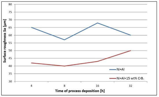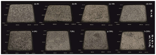 The quantitative assessment of the platelets’ topography helped to establish that the set milled with Ni and Al powders is characterized by ~40% higher roughness than the one milled with the addition of the ceramic phase, i.e., the average Sa was 40 μm and 60 μm, respectively (Figure 3). In the case of the former platelets, an extension of the milling time diminished the roughness by ~20%, but the latter platelet set, i.e., the one milled with the CrB2 addition, presented practically no changes within this processing time. The measurements performed for even longer times (16 h and 32 h) were taken from smaller areas free from chipping, but they were still useful to illustrate a tendency towards increased roughness with the milling time (plates milled with metallic powders for 32 h were the most affected by chipping).