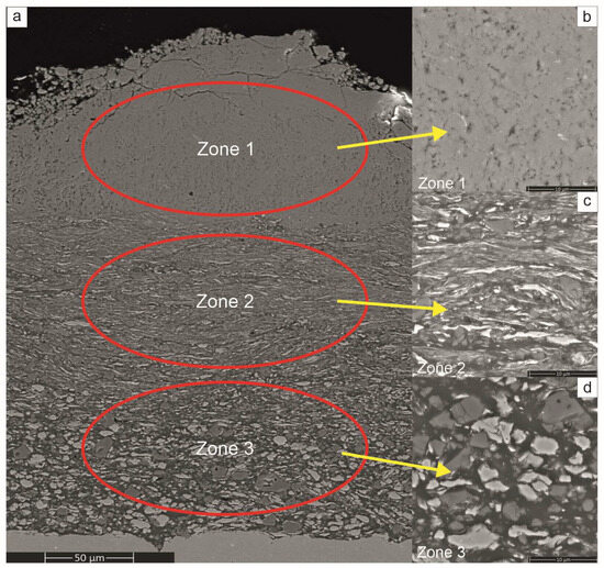SEM overview image of section of Ni+Al+CrB2 coating obtained after 4 h of deposition process (a) showing its gradient microstructure, i.e., amorphous/fine crystalline (b), small flattened particles (c) and coarse blocky particles (d).
