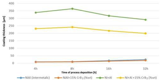 Graph representing deposition rate of coatings produced with Ni and Al powders, as well as with addition of CrB2 (for comparison, data concerning coatings obtained from milling steel platelets with pre-alloyed NiAl powder [17] were added).