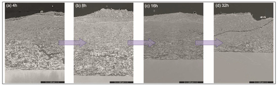 Measurements of the coating’s thickness during the milling helped to establish that a significant amount of deposit from the milled materials was added up over the platelets already at the early stages of this process (Figure 5). Later on, it thickened at a slower rate, i.e., as the milling time was doubled from 4 to 8 h, coating thickness increased by ~5%. Longer processing times of up to 16 and 32 h resulted in an evident (~10%) diminishing of the amount of the added material. The cause responsible for it turned out to be a development of cracks nucleated at the surface and propagating slant wise until they hit the middle zone. Then, the cracks were deflected and continued along the boundary between them (Figure 6). The above process led to a removal of larger amounts of material from the near-surface zone causing a decrease in the coating’s overall thickness. Milling of the steel substrates with intermetallic NiAl powders gave a much thinner cover over them, but even after longer milling times it was an increase as documented in the previous experiment (see respective lines in Figure 5).