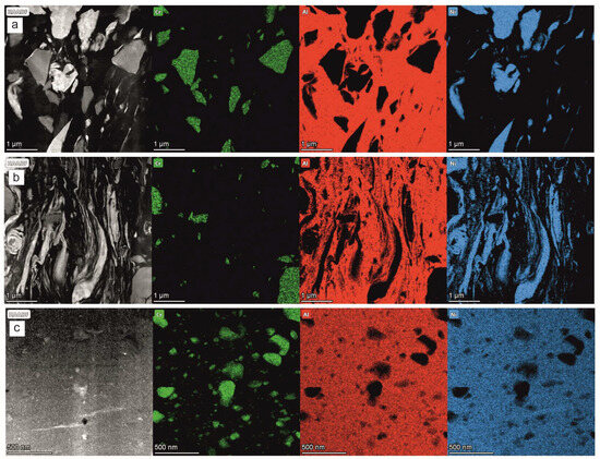 The microstructure and phase composition were characterized with the scanning and transmission electron microscopes (SEM/TEM), i.e., Scios 2 DualBeam (ThermoFisher Scientific, Eindhoven, The Netherlands) and Tecnai 200 kV FEG (FEI Company, Eindhoven, The Netherlands). The SEM imaging with back scattered electrons (BSE) was performed on metallographic sections of platelets ground on emery papers (up to 4000 grade) and finally polished using linen cloth pads sprayed with alumina suspension (grit 8000). The local chemical composition was measured with probe corrected Themis TEM (ThermoFisher Scientific, Eindhoven, The Netherlands) equipped with a large angle quad-silicon drift corrected EDS detector (Super-X). All mappings were built from a 500 × 500 pixel matrix. The lamellae for TEM observations were cut out with a beam of Ga+, i.e., focused ion beam (FIB) technique. The phase information was filtered by acquiring selected area electron diffraction patterns and solving them with the help of Process Diffraction software V_8.7.1 Q [22].