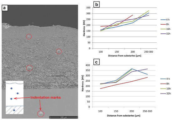 The hardness measurements were performed at the polished sections of the coatings, as shown in Figure 11a. On the one obtained through the milling of the platelets with metallic powders, they showed a gradual increase from ~160 HV close to the substrate, up to ~220 HV in the middle of the coating and up to ~300 HV close to the surface (Figure 11b). The highest scatter of hardness during these measurements was documented for an indent located in the middle of the coating, which might have been caused by the fact that this area was filled with intermixed highly flattened particles strongly differing in thickness. The same measurements performed for the coating formed through the milling with metallic powders containing CrB2 ceramic admixture showed significantly higher values in all specified areas, i.e., ~220 HV, ~300 HV and ~350 HV, respectively (Figure 10c). In this case, the scatter of averaged hardness values was the highest for the near surface areas for the coating obtained after 4 h of milling. It was caused to a large extent by the fact that after so short a processing time the matrix was already nano-crystalline and highly brittle, while some of the CrB2 particles were still imbedded in it, promoting cracks and local chipping of the freshly deposited material.