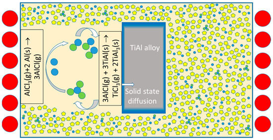 Schematic setup and transport principle of the pack cementation process (example of alumination of the TiAl alloy; blue: aluminium, green: chlorine, yellow: inert filler).