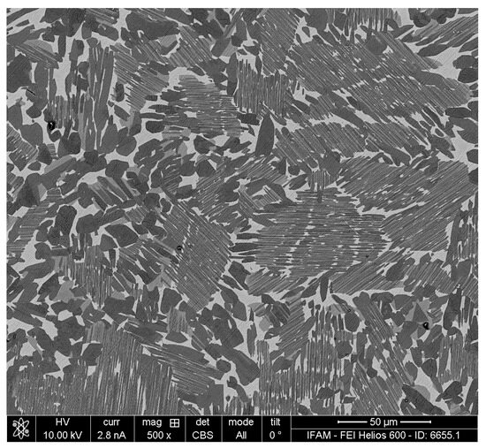 Polished surface of a TNM-B1 specimen, original state, SEM image—dark: γ-TiAl, grey: α2-Ti3Al, and bright: β- TiAl.