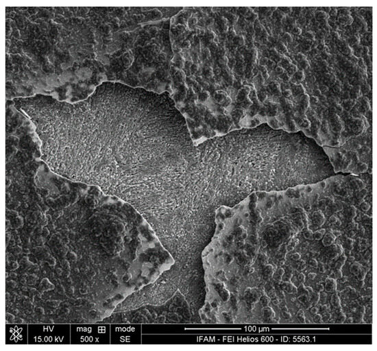 The specimens heat-treated with and without a halogen activator showed very similar macroscopic appearances: a rough surface with a partly spalled oxide scale (see the example in Figure 4). However, on a microscopic scale, both the oxide scale and the underlying substrate surface differ considerably (Figure 5 and Figure 6). The oxide scale of the activator-treated specimen exhibits bulbous structures on top of a finer crystalline layer. The reference specimen only shows the latter. The substrate surface below the scale of both specimens is very rough. Three different, typical structural elements can be distinguished: