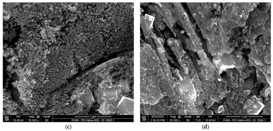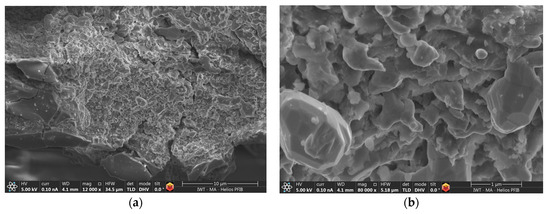 As can be seen in Figure 6, the latter areas exhibit porous structures in the case of the activator-treated TNM-B1 (Figure 6a,c), whereas the corresponding regions of the reference specimen are characterized solely by very rough surfaces (Figure 6b,d).