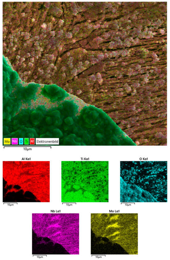 Figure 8 shows the results of the EDS mapping of the surface of the activator-treated specimen with a partly spalled oxide scale. Clearly, Ti and O dominate in the outer nodular zone of the oxide scale. The fine-crystalline oxide layer below the nodules seems to consist of alumina. Furthermore, there is a strong indication that the small smooth crystallites on the surface below the scale are also alumina. No traces of Nb and Mo are detected in the nodular scale. EDS measurements on the FIB section (Figure 7) showed an increase of the Nb and Mo contents compared to the original precursor content of 4 at% to 14 at% and 1 to 7 at%, respectively, whereas the aluminum content dropped from 43.5 to 33 at%. The Ti content changed slightly from 51 to 46 at% in comparison to the original material.