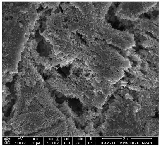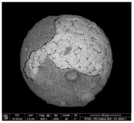 The results obtained for the TNM-B1 powder closely followed the observations made on the block material. In Figure 9, an activator-treated particle is shown after soft grinding. Obviously, the scale detaches easily from the underlying metal surface. The macroscopic appearance of scale and metal is quite similar to what is seen on the activator-treated alloy block (compared to Figure 4). One difference is the more dendritic surface topography of the powder particle’s metal surface, which can be attributed to the higher solidification rate during the production of the powder particle. Higher-resolution SEM images reveal a porous structure of the metal, with pore sizes in the range of 50–100 nm (Figure 10). EDS mapping and area measurements showed that the scale is oxidic. Excluding oxygen, the main metal component of the scale is Ti with 88 at%. The Al content is reduced to only 6.5 at%. In addition, an Fe content of 4.3 at% is found. Furthermore, small traces of Si, V, and Cl were also found. In contrast, neither Mo nor Nb were found in the scale. In the porous structure, the EDS results are (in at%): Ti: 53, Al: 36, Fe: 1.6, Nb: 6.6, and Mo: 1.7, as well as small traces of Si and Cl (in comparison, EDS results for the original, untreated powder revealed (in at%): Ti: 55, Al: 40, Nb: 4, and Mo: 1).