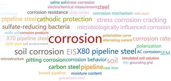 Following a thorough search of 821 articles pertaining to soil corrosion in WOS, we proceeded to extract the keywords provided by the authors and conducted a statistical analysis of their frequency. This procedure led us to identify the keywords that appeared 20 times or more, as illustrated in Figure 2. The figure clearly depicts that the primary areas of focus within soil-corrosion research encompass corrosion studies, electrochemical impedance spectroscopy, cathodic protection, and pipeline-steel corrosion.