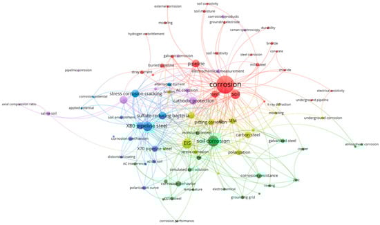 To unveil the distribution of hotspots within the research field of soil corrosion, a network clustering analysis was conducted using the extracted keywords from WOS. The outcomes of this analysis are presented in Figure 3. The size of each circle corresponds to the number of published papers, while the connecting lines between different organizations signify related studies. Notably, Figure 2 illustrates that the primary research areas in soil corrosion have predominantly revolved around factors such as water content and resistivity, with comparatively less attention given to corrosion mechanisms and the operating conditions of underground metals.