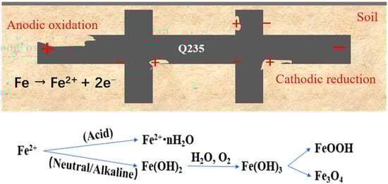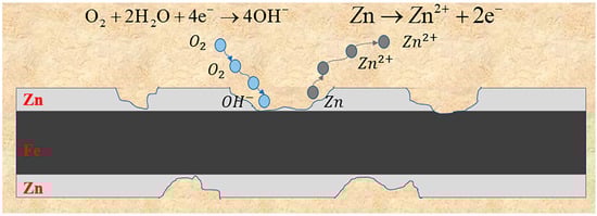 Galvanized steel. Galvanized steel refers to carbon steel that has been coated with a layer of zinc. This process involves either electroplating or hot-dip plating the zinc onto the surface of the carbon steel. It presents several advantages such as its simplicity, low cost, and strong conductivity. Consequently, it has become the most prevalent method in China for safeguarding grounding grids. The galvanized layer, which forms a dense oxide film, serves as protection for the underlying steel matrix [,]. As zinc possesses a lower electrode potential than carbon steel, a primary cell is formed between the zinc layer and the carbon steel. In this electrochemical setup, zinc is consumed through oxidation as the negative electrode, while the positive electrode, carbon steel, benefits from protective reduction []. Empirical evidence supports the notion that the galvanized layer plays a crucial role in safeguarding the underlying carbon steel base [,]. However, when galvanized steel is employed as a grounding material, its corrosion resistance only offers marginal enhancement compared to ordinary carbon steel. Over time, the zinc layer begins to corrode, rendering the corrosion products incapable of preserving the underlying structure. This susceptibility arises due to the limited thickness of the galvanized layer and potential defects during the hot-dip-plating process. Subsequent to the damage of the zinc layer, deleterious anions come into contact with the substrate, drastically accelerating the corrosion of the substrate [,,]. As the exposed area of the substrate expands, the galvanized layer becomes incapable of protecting it, leading to equivalent corrosion rates between galvanized steel and carbon steel when placed in soil. Consequently, as corrosion progresses, the substrate suffers rapid deterioration. The corrosion mechanism of galvanized steel is shown in Figure 5.