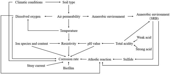 Soil is a complex system consisting of substances across gaseous, liquid, and solid states. Various factors exert an influence on the corrosive nature of soil, comprising its physical and chemical attributes, electrochemical properties, microorganisms, stray currents, as well as climatic considerations such as temperature [,,,]. The interconnectedness of these factors mandates a comprehensive evaluation approach in assessing the corrosiveness of soil. Figure 6 illustrates the intricate interplay among the different components contributing to soil corrosion.