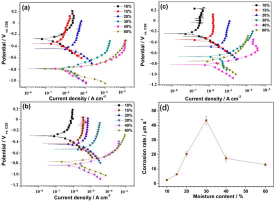 Polarization curves of Q235 steel in the Na-based bentonite clays at different moisture contents over time: (a) 240 h; (b) 720 h; (c) 1080 h. (d) Average corrosion rate of Q235 steel soaked in the Na-based bentonite clay for 1080 h with different moisture contents [].