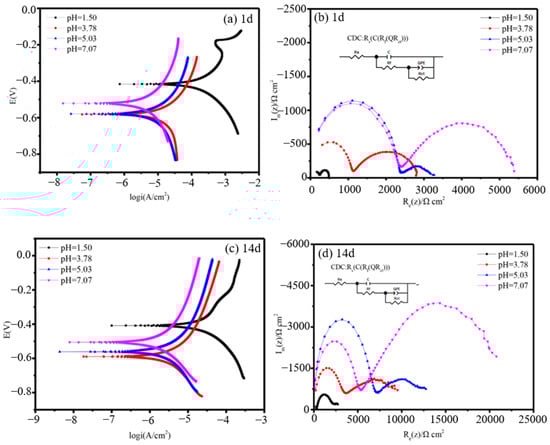 Polarization curves and EIS of X70 steel in the contaminated-silt system at pH values of 1.50, 3.78, 5.03, and 7.07: (a,b) 1 d; (c,d) 14 d [].