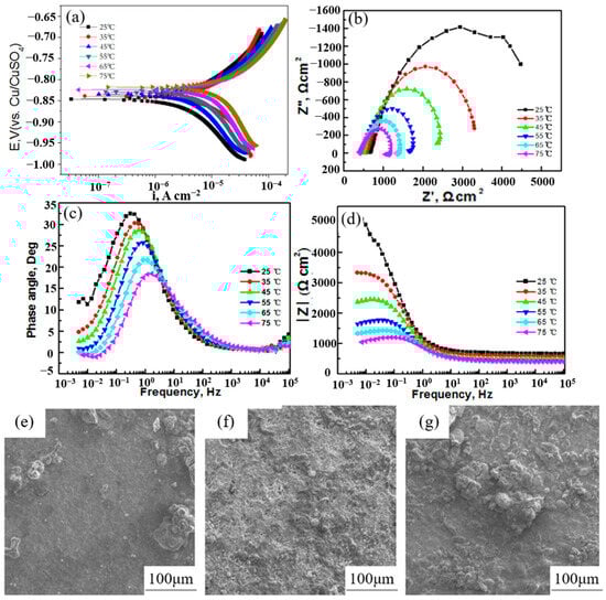 Potentiodynamic polarization curves (a) and EIS (b–d) of X80 steel after burying for 24 h in the temperature range 25 °C to 75 °C. SEM images of X80 steel after burying for 240 h at different temperatures: (e) 25 °C, (f) 55 °C, (g) 75 °C [].