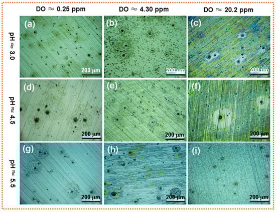 Surface OM image of X80 steel after EIS test in the acidic soil-simulated solution with various pH and DO contents. (a) pH ≈ 3.0 and DO ≈ 0.25 ppm; (b) pH ≈ 3.0 and DO ≈ 4.30 ppm; (c) pH ≈ 3.0 and DO ≈ 20.2 ppm; (d) pH ≈ 4.5 and DO ≈ 0.25 ppm; (e) pH ≈ 4.5 and DO ≈ 4.30 ppm; (f) pH ≈ 4.5 and DO ≈ 20.2 ppm; (g) pH ≈ 5.5 and DO ≈ 0.25 ppm; (h) pH ≈ 5.5 and DO ≈ 4.30 ppm; (i) pH ≈ 5.5 and DO ≈ 20.2 ppm [].