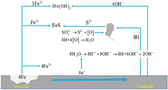 SRB can exert their corrosive effect through various mechanisms, including the cathodic depolarization mechanism, concentration cell mechanism, local cell mechanism, metabolite mechanism, acid-corrosion mechanism under sediment, and anodic-zone-fixation mechanism []. Among these mechanisms, the cathodic depolarization theory is widely recognized and accepted. According to the cathodic depolarization theory, SRB utilize ions present on the metal surface to reduce sulfate, leading to the production of sulfides. This process disrupts the normal electrochemical reactions occurring at the metal surface and contributes to the corrosion of the material. Figure 13 illustrates the corrosion mechanism associated with SRB. It is important to note that SRB can employ multiple mechanisms simultaneously, and the specific mechanism involved may vary depending on the environmental conditions and the type of material being corroded. Understanding these mechanisms is crucial for implementing effective corrosion-control strategies in environments where SRB activity is present.
