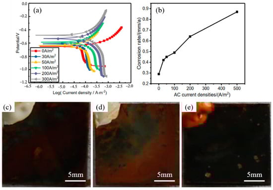 (a) Potentiodynamic polarization curves of X100 steel under various AC densities in simulated-acidic-soil solution. (b) Corrosion rates of X100 steel corroded in simulated-soil solution for 96 h at different AC densities. Optical images of the corrosion products of X100 steel in the simulated-acidic-soil solution after about 96 h under AC densities of (c) 0 A/m2, (d) 50 A/m2, and (e) 500 A/m2 [].