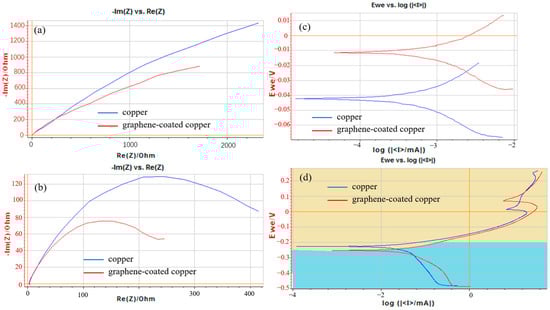 (a) Electrochemical impedance spectroscopy of bare and graphene-coated copper conductors in 0.5 M (0.5 molecular-weight gram powder in, per litre, volume of solution) Sodium sulphate solution. (b) Potentio electrochemical impedance spectroscopy of bare and graphene-coated copper conductors in 0.1 M sodium chloride solution. Polarization curves of the graphene-coated and uncoated copper in different solutions: (c) 0.5 M sodium sulphate solution; (d) 0.1 M sodium chloride solution [].