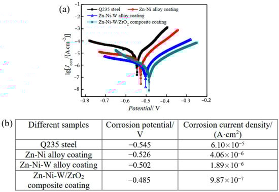 (a) Polarization curves of Q235 steel and different electrodeposited coatings in simulated-soil pore solution. (b) Fitting results of polarization curves [].