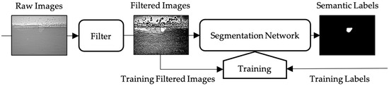 The workflow of the whole segmentation process is shown in Figure 1: Raw X-ray images are processed with a designed filter and then fed into the segmentation network, which outputs the semantic labels. The segmentation network needs to be previously trained by filtered images and ground truth labels in the training set.
