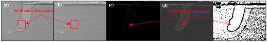 The Subtract step in the filter removes a stationary obstruction affiliated to the dataset: (a) a standardized image with the obstruction inside the keyhole; (b) the subtraction value as an image, average of 40 previous images in the same dataset, containing the obstruction; (c) the subtracted image, where the obstruction is removed by the Subtract step; (d) the rescaled subtracted image for visualization; (e) binarized image, the output of the filter, with no obstruction.