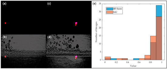 Segmentation errors in run 2, testing dataset 3: (a) overlay of the predicted label and ground truth of a failed segmentation example, no label is predicted by BASNet (predicted label in blue, ground truth in red, intersection in purple); (b) overlay on the input filtered image; (c) another failed segmentation example, where the “tail” of the keyhole region is missed by prediction; (d) overlay on the input filtered image; (e) histogram of the distribution of tested images in testing dataset 3 in run 2 regarding two evaluation matrices (Number of images with respect to BF-Score in blue, IoU in red, and overlapped in darker orange). Blue area in (a–d) is barely visible because there is little predicted area that is not ground truth.
