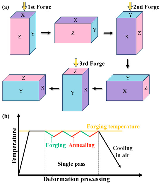 The experimental alloy was a commercially available rolled ZK61 sheet, and the chemical composition of the alloy is shown in Table 1. The sample was water-quenched after homogenization at 400 °C for 50 h, then cut into 100 mm × 60 mm × 40 mm billets before proceeding to MDF. First, the billets were heated to 400 °C in a furnace for 2 h. Since heat is consumed when the mold is installed, the mold temperature is higher than the billet temperature, and the mold was kept at 450 °C for 6 h. As shown in Figure 1a, the initial forging direction is parallel to the extrusion direction, and the loading direction changes by 90° per pass (i.e., X to Y to Z to X ···) between the continuous forging passes. When the deformation in the X, Y, and Z directions is completed, it is known as a complete deformation pass of MDF, with a total of two passes performed. There were no significant changes in the dimensions of the blanks after MDF, and the samples were cooled to room temperature in air, as shown in Figure 1b. The MDF samples were aged at 150 °C for 36 h before the microstructure and mechanical properties after different treatments were analyzed.