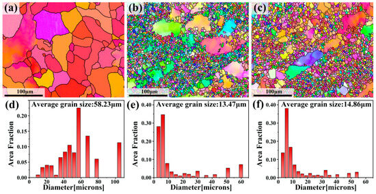 In order to further investigate the initial microstructure of the three samples, EBSD analysis was performed. Figure 3a–c show the EBSD maps of homogenized samples, MDF samples, and aged samples. It can be found that the homogenized samples had significantly finer grains after passing through two MDF passes. After the aging of the MDF sample, the grain size changed little because of the low aging temperature. Figure 3d–f show the grain size distribution maps of three samples. The average grain sizes of the homogenized sample, MDF sample, and aged sample were about 58.23, 13.47, and 14.86 μm, respectively. The maximum grain size of the homogenized sample can reach 104.48 μm. After MDF, the maximum grain size was reduced to 60.51 μm, and the average grain size of fine grains was 6.25 μm. The average grain size of the homogenized sample was reduced by 23% after MDF.