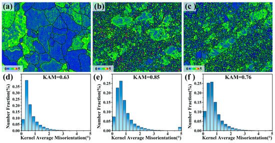 Figure 4 shows the kernel average misorientation (KAM) map and the corresponding KAM distribution map of the three samples. The KAM map shows the strain degree and local dislocation density of the sample after the deformation process. Three different colors, blue, green, and red, are usually used to indicate dislocation density. The gradual increase in dislocation density is indicated by the color change from blue to green to red, which can also be used to indicate the concentration of local residual stress [15,16]. Figure 4a shows that there are many green areas in some CGs and their grain boundaries of the homogenized samples, but the distribution is very uneven. Figure 4b,c show that the green areas of the MDF sample and the aging sample are more widely and evenly distributed. In the MDF sample, there are red areas at some fine grain boundaries that are reduced after aging. It can be seen that the green area in the KAM map of the homogenized sample increases after MDF (from Figure 4a,b), indicating an increase in dislocation density. This phenomenon indicates that dislocations accumulate in the grains due to the generation of strain. Figure 4d–f show that the average KAM values of the three samples are 0.68, 0.89, and 0.76, respectively. The precipitated phases and macrotexture of the samples after MDF and aging treatment are shown in Figures S1 and S2.