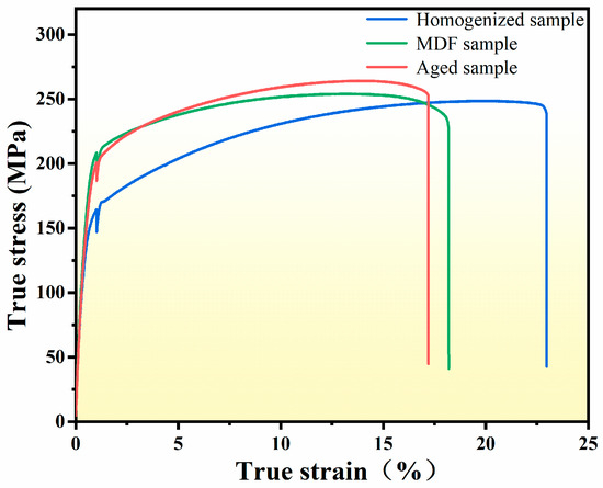 The hardnesses obtained by hardness testing for homogenized samples, MDF samples, and aged samples were 57.57, 65.48, and 67.85 HV, respectively. Figure 5 shows the engineering stress–strain curves for the three samples. The tensile strength and ductility of the homogenized sample were 248.63 MPa and 24.9%, respectively. After MDF, the tensile strength of the sample increased to 254.11 MPa, but the ductility decreased to 20.6%. The MDF sample achieved a tensile strength of 264.18 MPa and an elongation of 19.4% by aging.