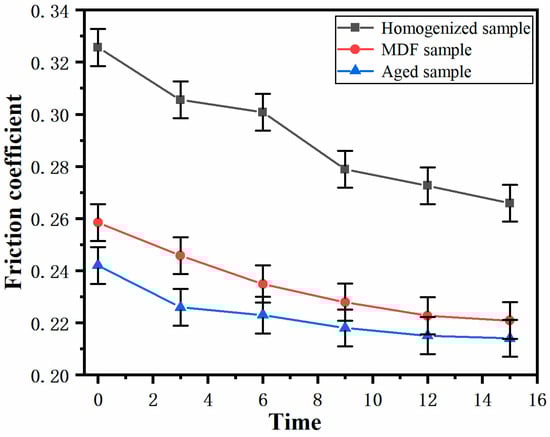 The friction coefficient has a decisive effect on the wear resistance of a mechanical structure [17,18]. Figure 7 shows the variation trend of the average friction coefficient of the homogenized sample, the MDF sample, and the aged sample under continuous sliding friction. As can be seen from the figure, among the three groups of samples, the average friction coefficient of the homogenized sample is the largest, followed by the MDF sample, and the aged sample has the smallest average coefficient of friction. It may be due to the grain crushing and refinement of the sample after MDF treatment, which improves the wear performance of the sample, and during the wear process, due to the severe plastic deformation caused by MDF, the plastic strength decreases accordingly, resulting in a decrease in the wear marks of the sample, especially the depth. As a result, the friction coefficient of the MDF sample becomes smaller. The hardness of MDF samples was further improved by aging treatment. The higher the hardness of the sample is, the lighter the friction pair falls into the surface of the sample. The friction coefficient decreases due to the decrease in the actual contact area and the molecular force between the sample surface. Figure 7 shows that with the increase in time, the average friction coefficient of homogenized samples, MDF samples, and aged samples is large from the beginning and then gradually decreases. At the beginning, the larger friction tangential force hinders the sliding of the friction pair, so the friction coefficient rises to the maximum at the beginning. When the two friction pairs have relative sliding wear, the running-in stage is first carried out. When the wear surface is gradually flattened and the contact area increases, it will enter a normal and stable sliding so that the friction coefficient begins to decrease and remain in a stable state. This is the main reason for the above phenomenon.