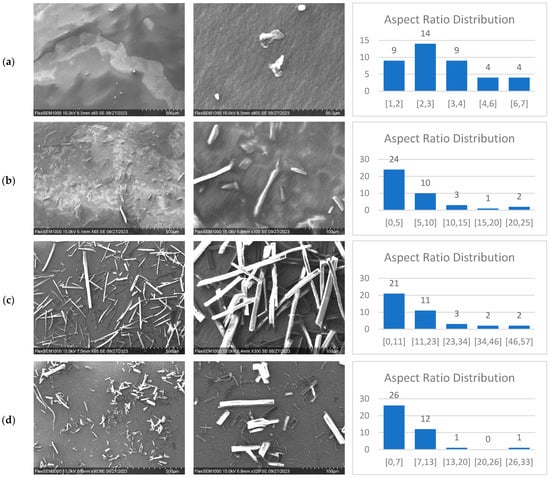 (a) SEM images and aspect ratio distribution of CNC using sulfuric acid, (b) SEM images and aspect ratio distribution of CMF using sulfuric acid, (c) SEM images and aspect ratio distribution of CMF using citric acid, (d) SEM images and aspect ratio distribution of CMF using oxalic acid.