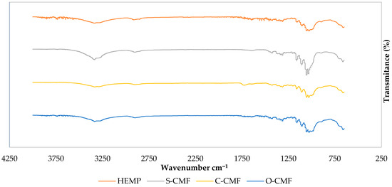 FTIR spectra of Hemp, S-CMF, C-CMF, and O-CMF.