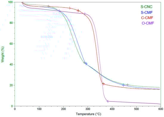 Thermogravimetric graph of S-CNC, S-CMF, C-CMF, and O-CMF.