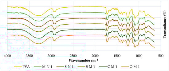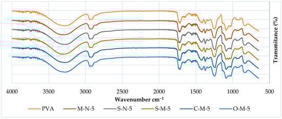 The chemical behavior of both neat PVA and PVA biocomposites was investigated through FTIR analysis, as illustrated in Figure 4 and Figure 5. The FTIR spectra of PVA reveal several prominent absorption bands. It is evident that all the spectra are similar, except for a few small changes. The peak at around 3274 cm−1 corresponds to the stretching vibration of (-OH), resulting from intramolecular hydrogen bonds within the PVA and intermolecular hydrogen bonding between hydroxyl groups of PVA and CNC. Notably, in cast films with reinforcement, the addition of CNC intensifies the peak at 3274 cm−1 [56].